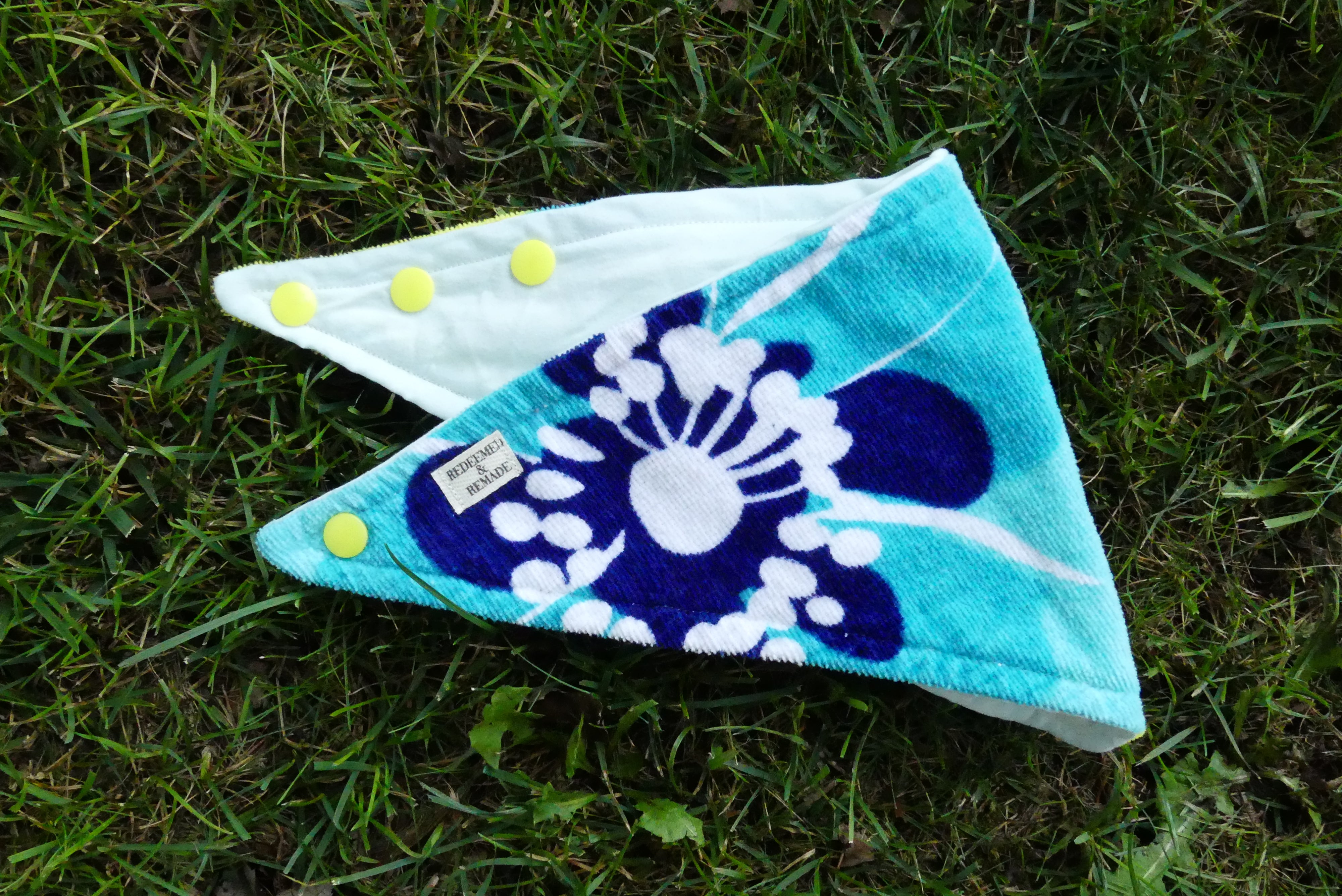 Reversible bandana bib made with plastic snaps.Potential Choking Hazard: Small snaps could present a choking hazard if removed from garment and ingested. Supervision advised.