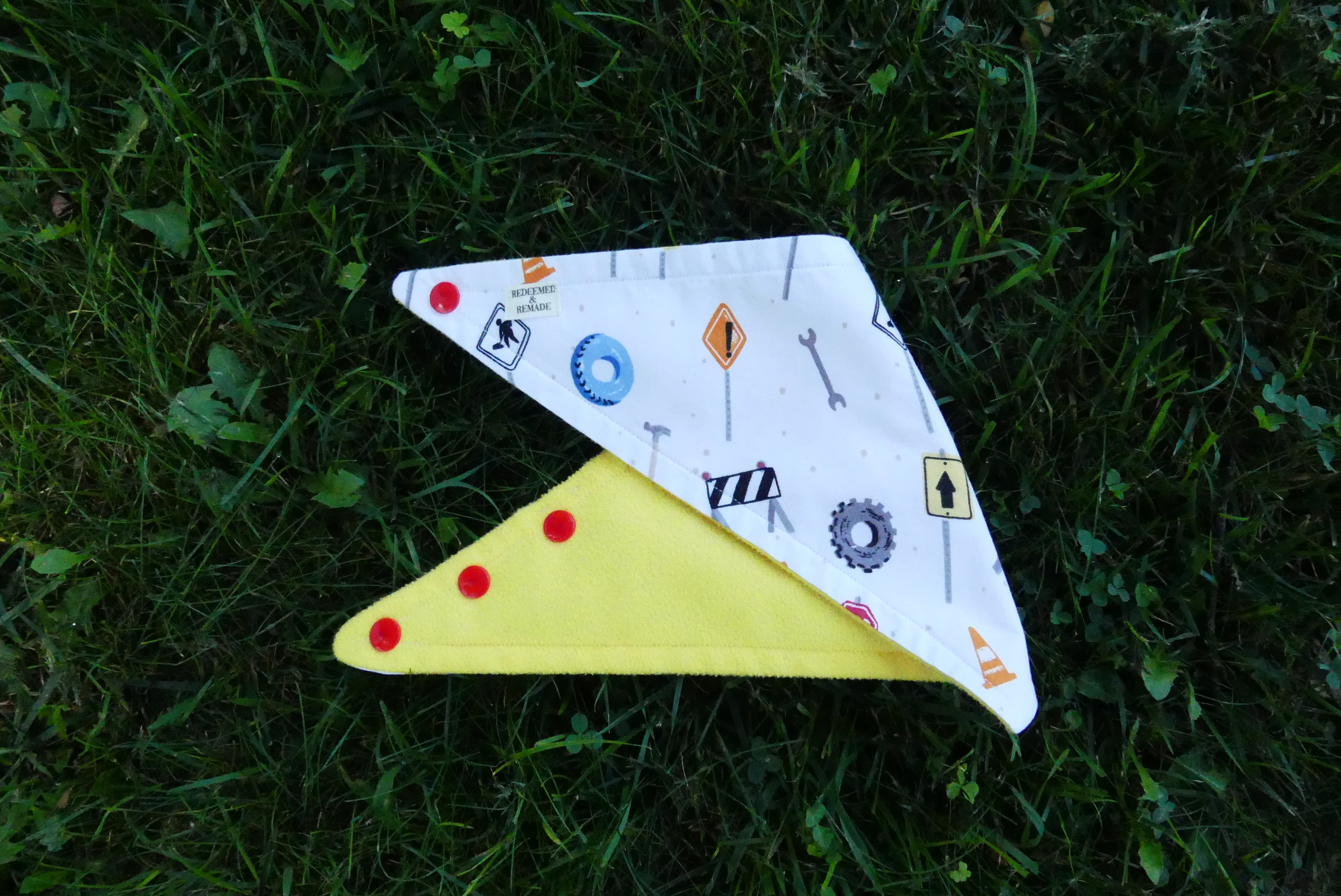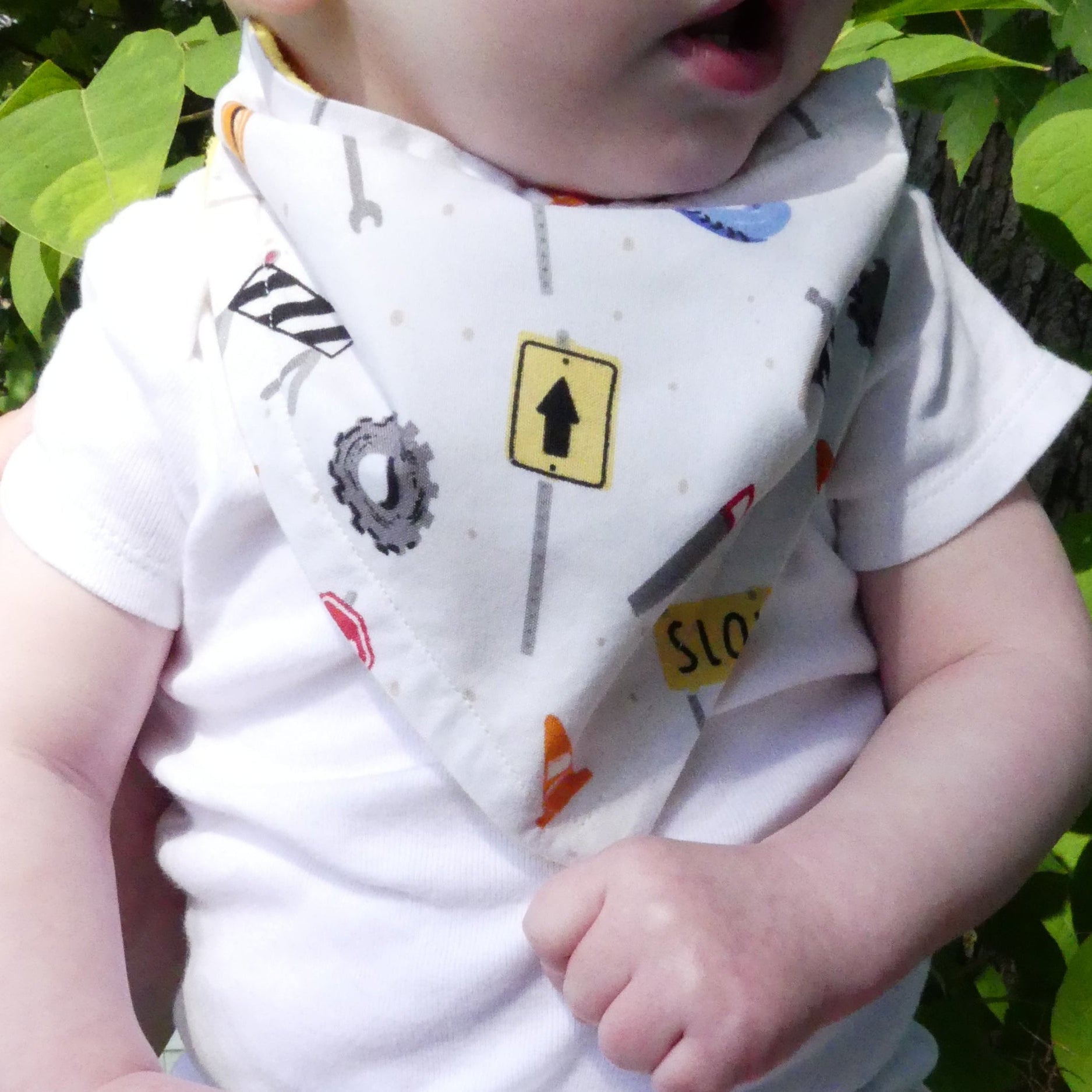 Reversible bandana bib made with plastic snaps.Potential Choking Hazard: Small snaps could present a choking hazard if removed from garment and ingested. Supervision advised.
