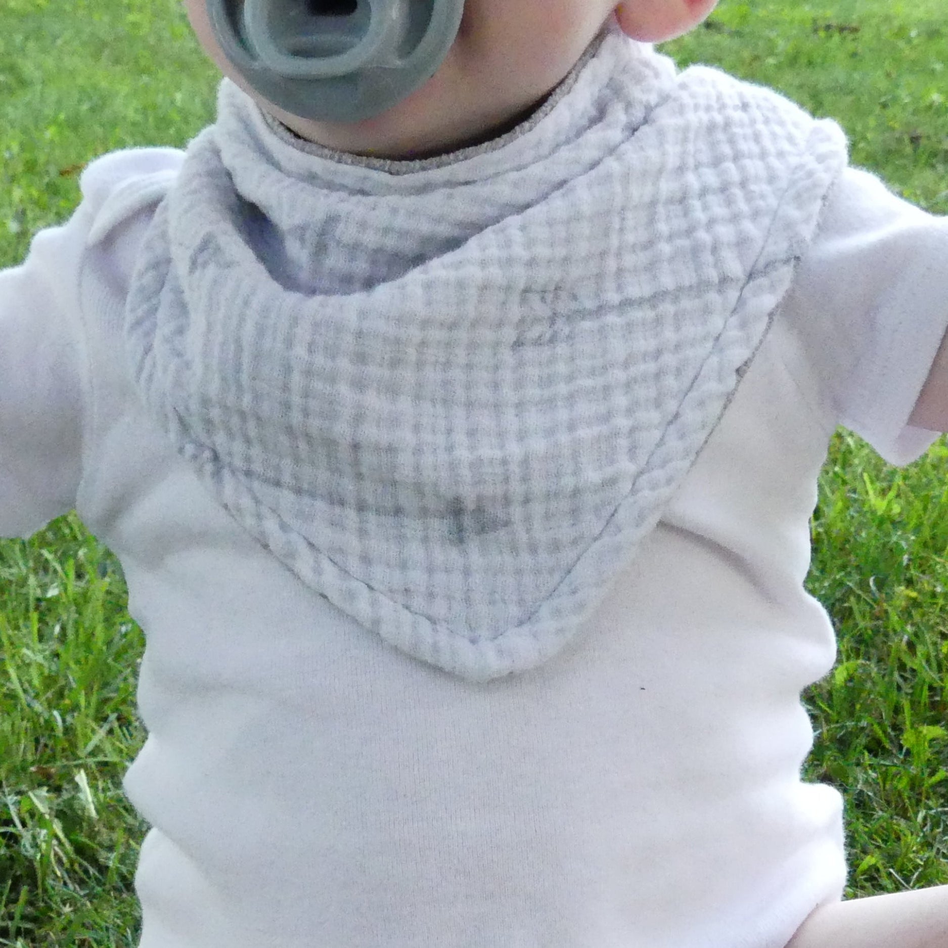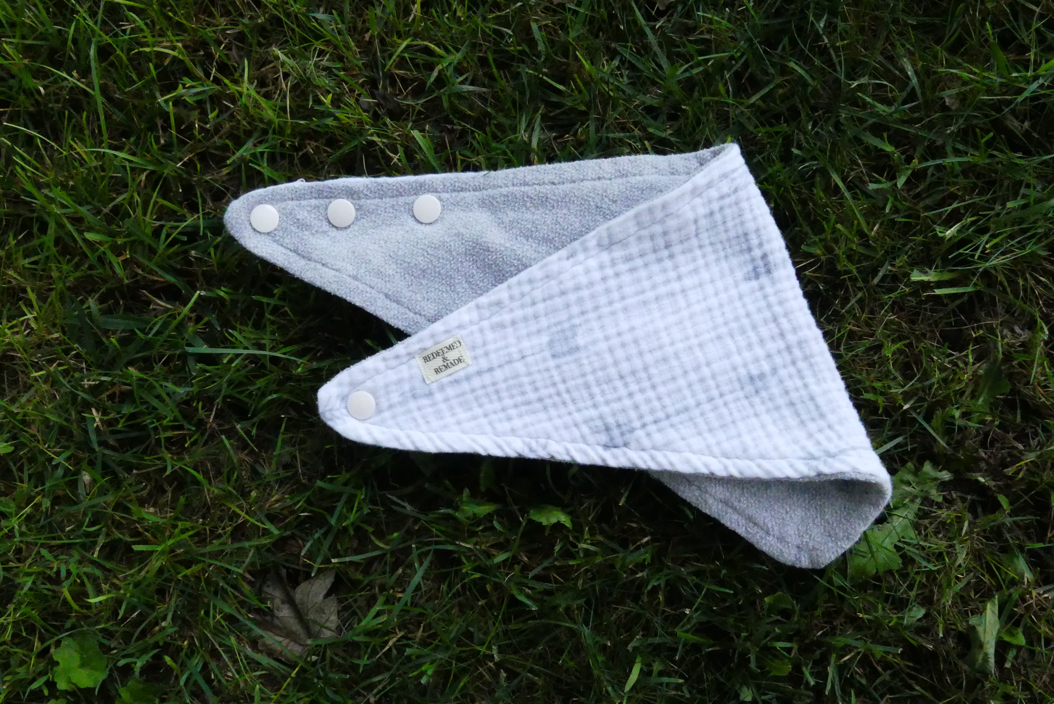 Reversible bandana bib made with plastic snaps.Potential Choking Hazard: Small snaps could present a choking hazard if removed from garment and ingested. Supervision advised.