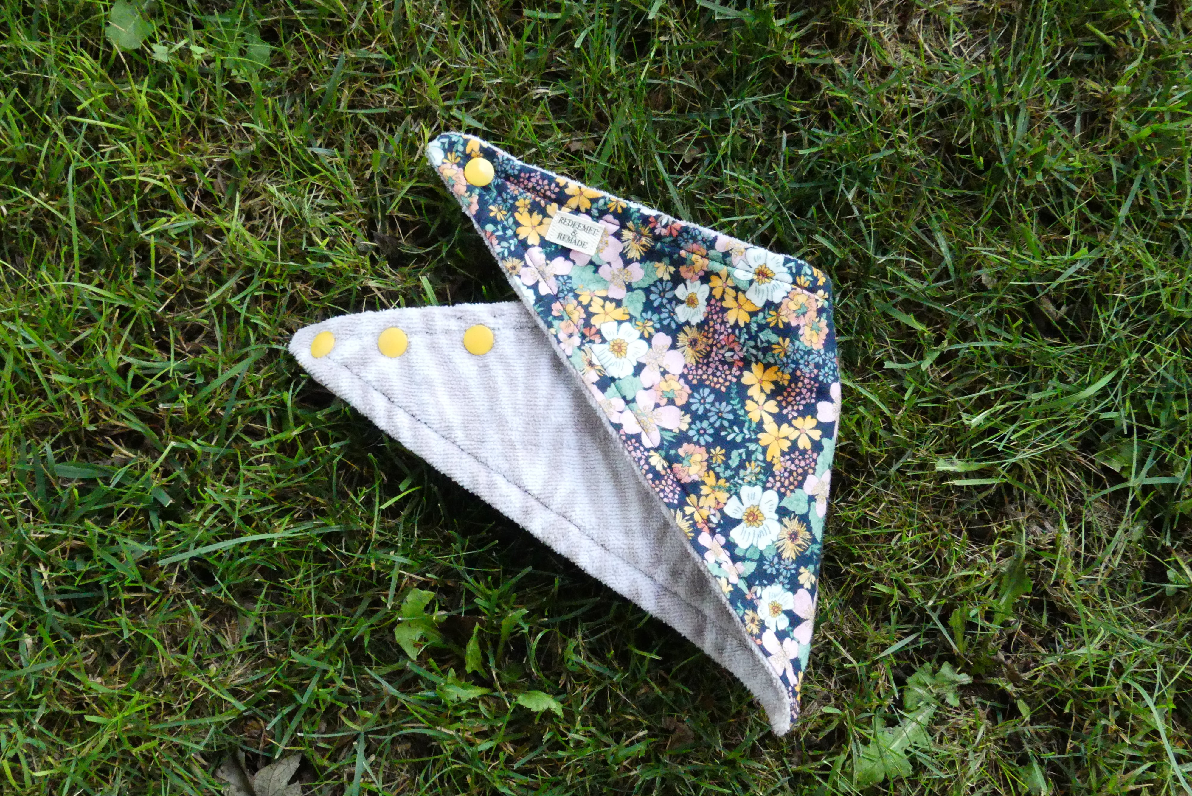 Reversible bandana bib made with plastic snaps.